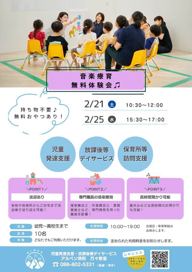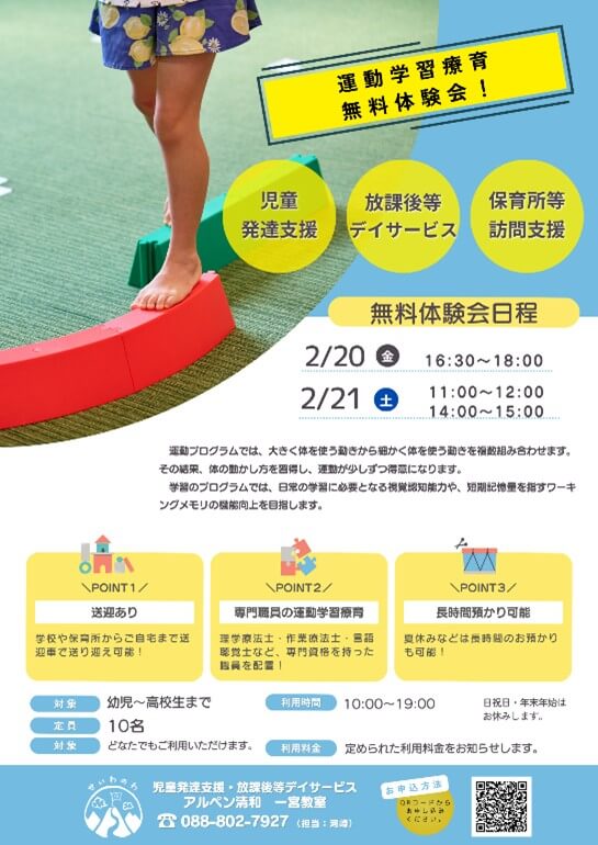 このたび、一宮教室(運動学習療育)・万々教室(音楽療育)の体験会を下記日程で開催する運びとなりました。体験会当日は、実際の支援・療育をご体験いただけます。また、職員が常駐し、個別の相談も可能です。